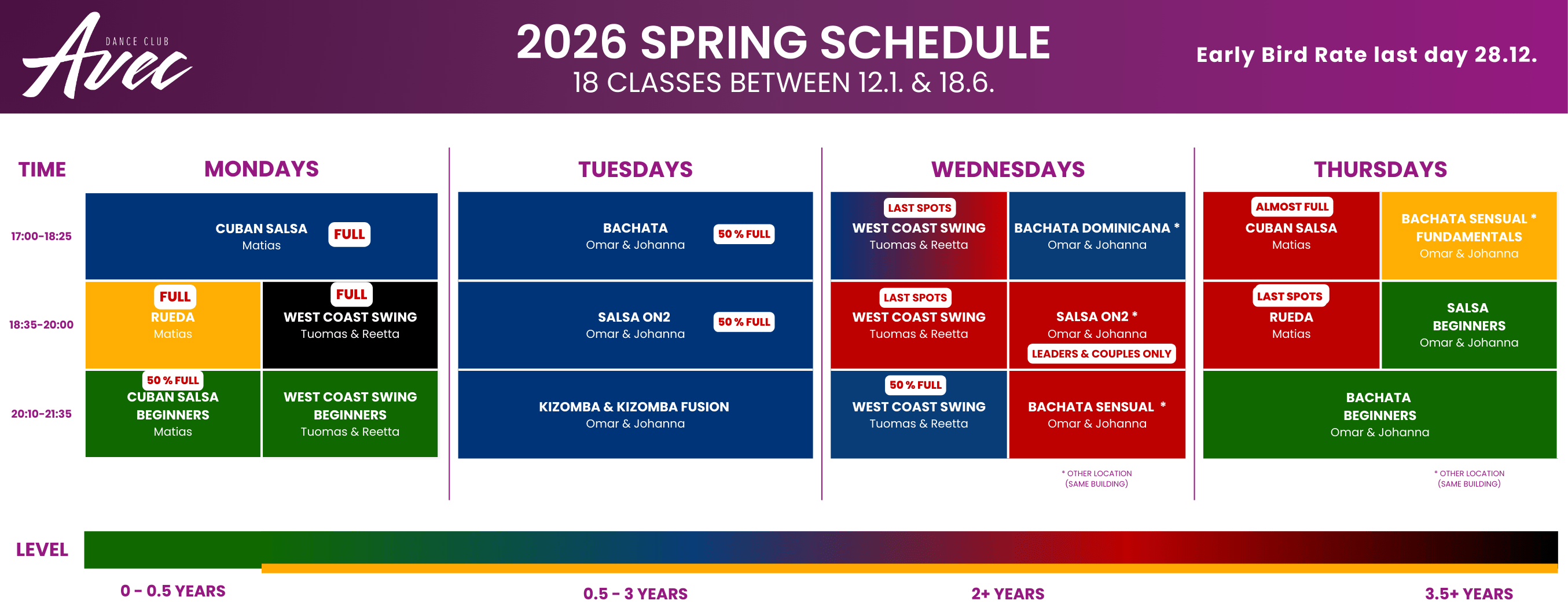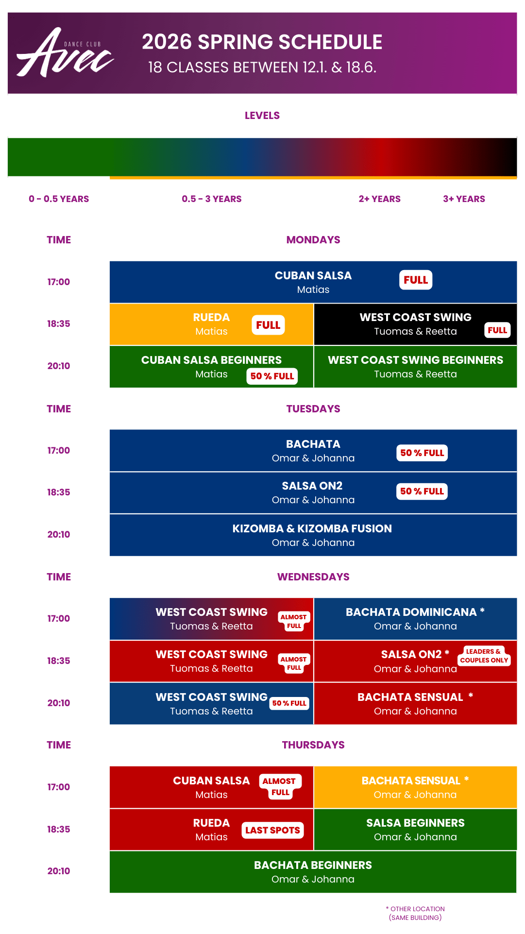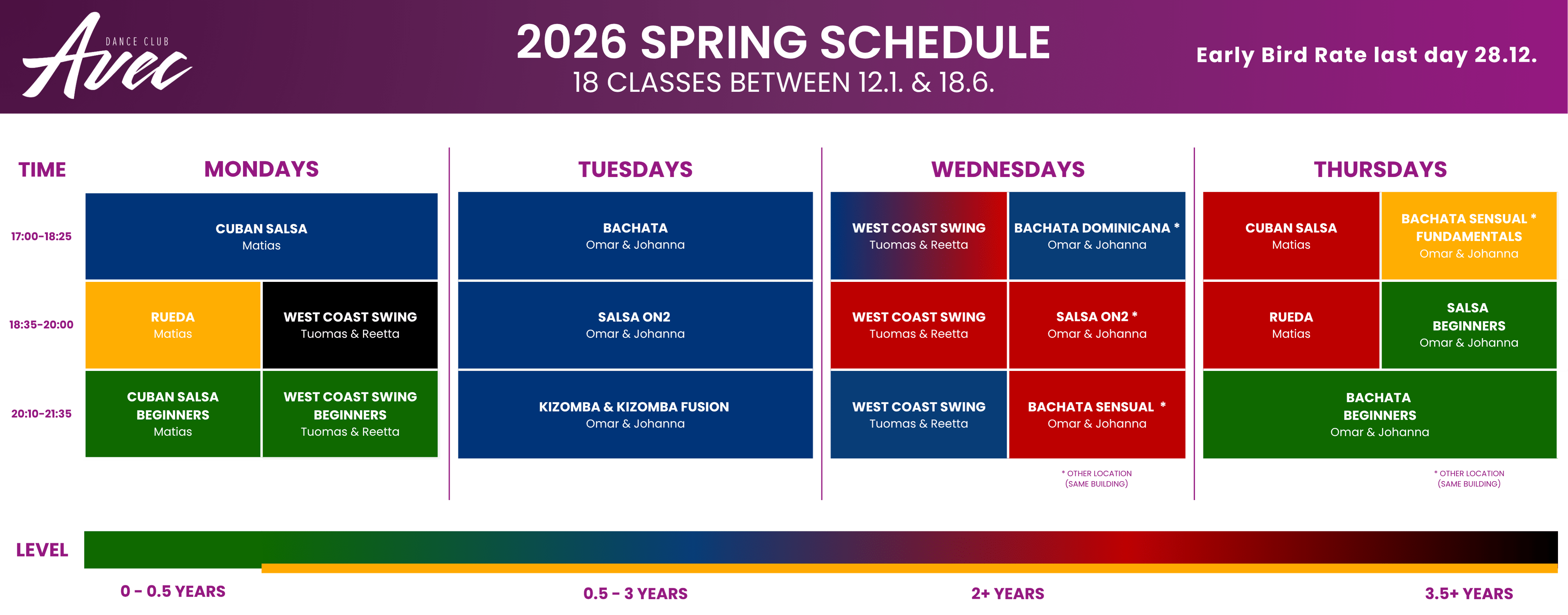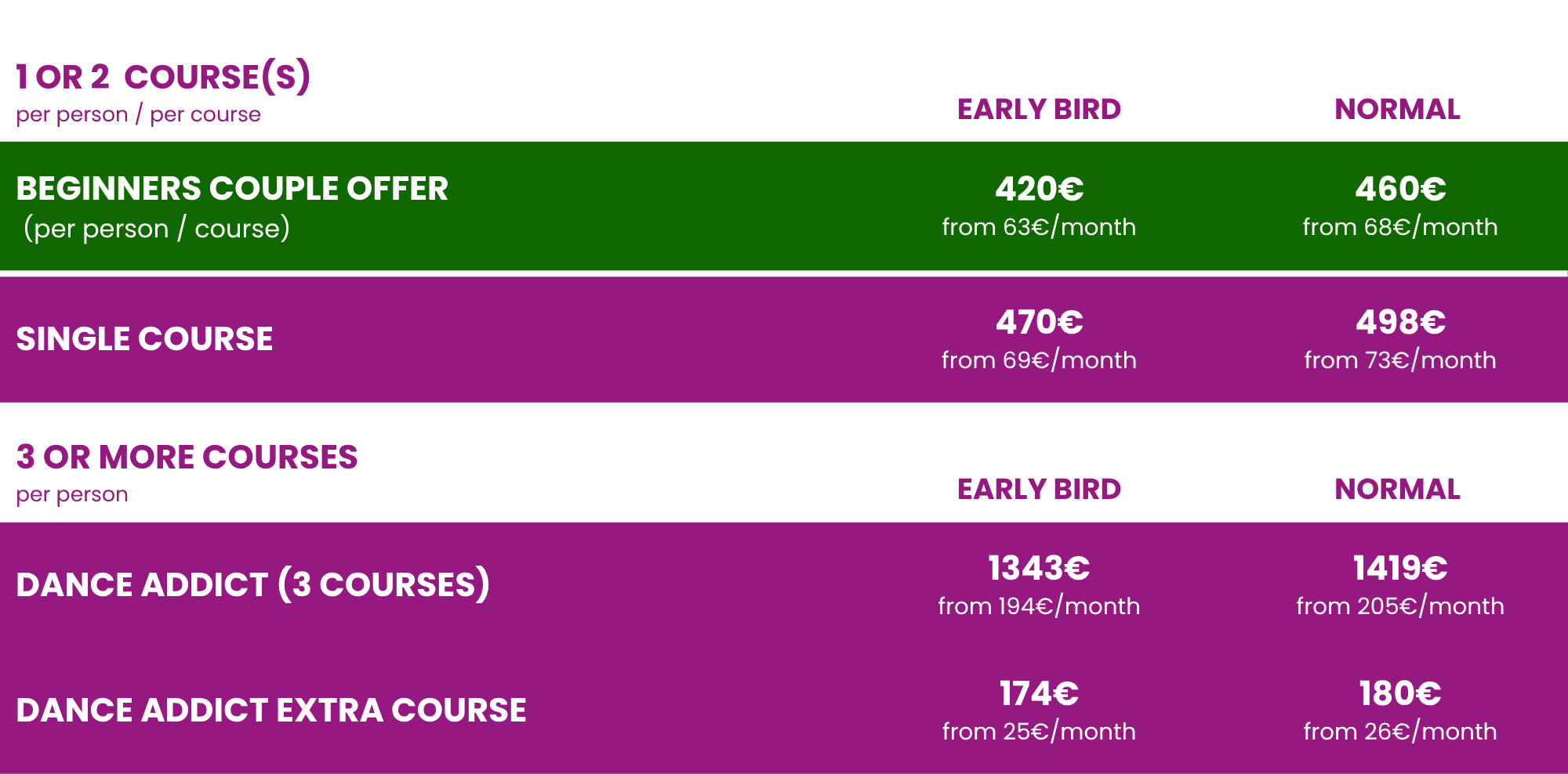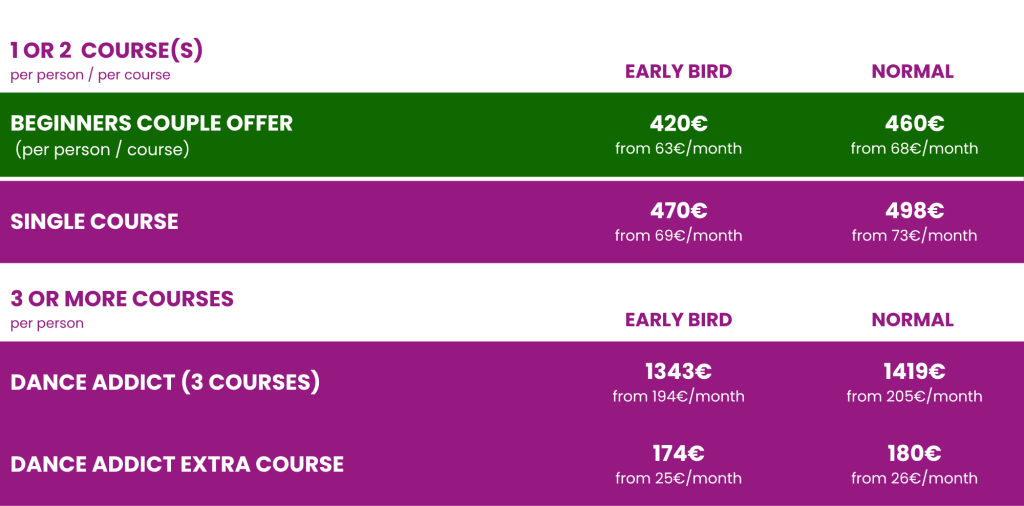 When you don’t have a partner to register for a partner course you can register for a waitlist spot. You can do this for each Partner course you want to attend that you don’t have a partner for. We will add followers & leaders to the courses in order of registration, while keeping the follower/leader ratio within our set ratio. Waitlist fee is 50€/Course.